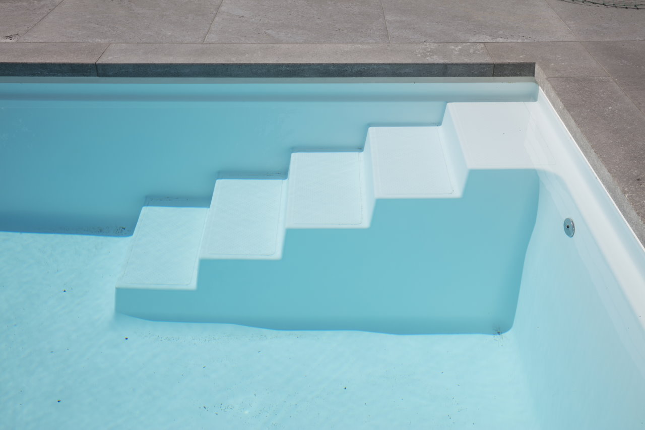 D•LINE ANCONA – Die neue Treppenanlage von RivieraPool. Zeitloses Design und maximales Schwimmvergnügen auf ganzer Beckenlänge.