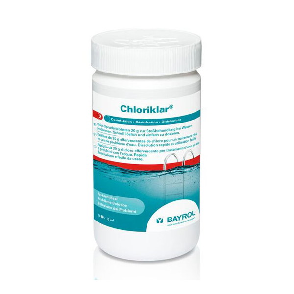 Chlor-Sprudeltabletten 20 g mit hohem Aktivchlorgehalt zur Stossbehandlung bei Wasserproblemen.