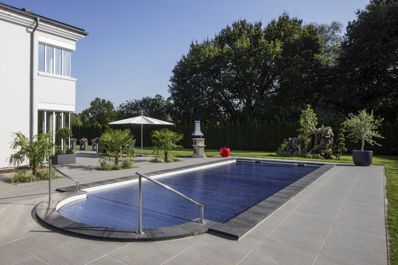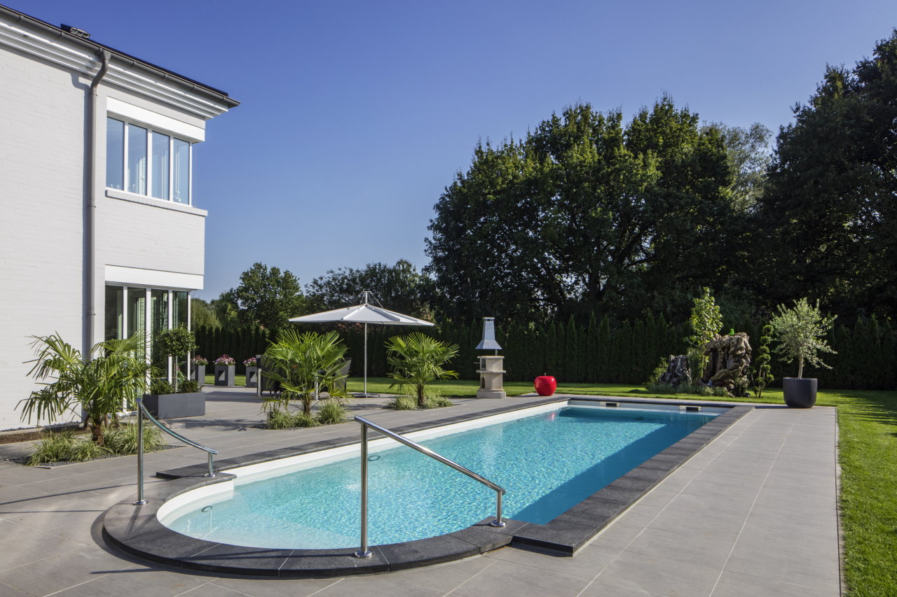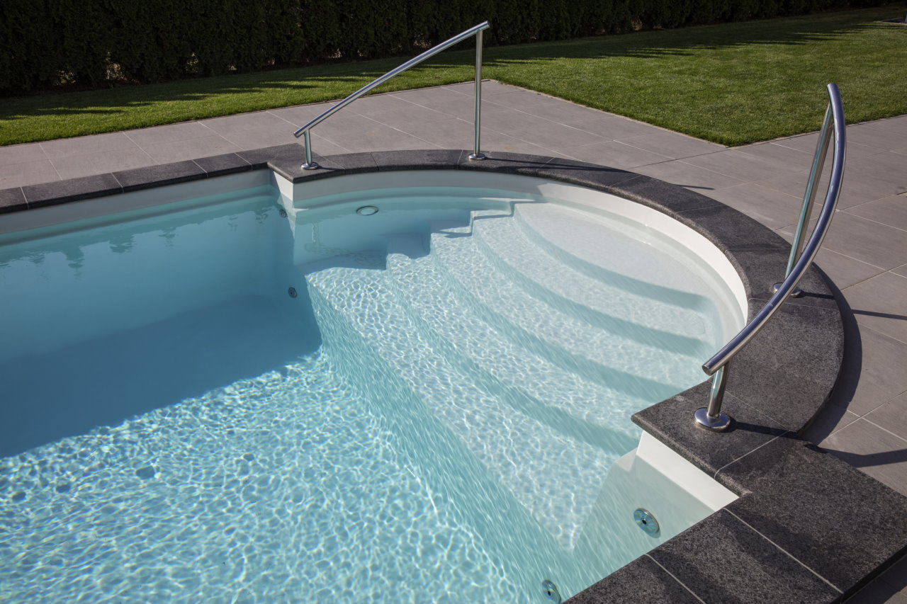 Einstückschwimmbecken aus Epoxy-Acrylat. 5-stufige Treppenanlage, 6° Wandschräge und Rollladensicherheitskante mit integriertem Stahlrahmen. Becken in Sandwichbauweise mit 20 mm Isolierung in den Wänden und 30 mm im Boden.